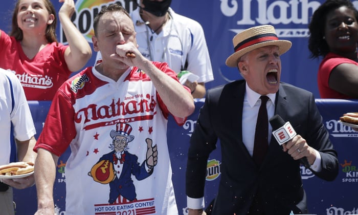 Joey Chestnut Eats Record 76 Hot Dogs In 10 Minutes To Win Nathan S Famous Title Us Sports The Guardian